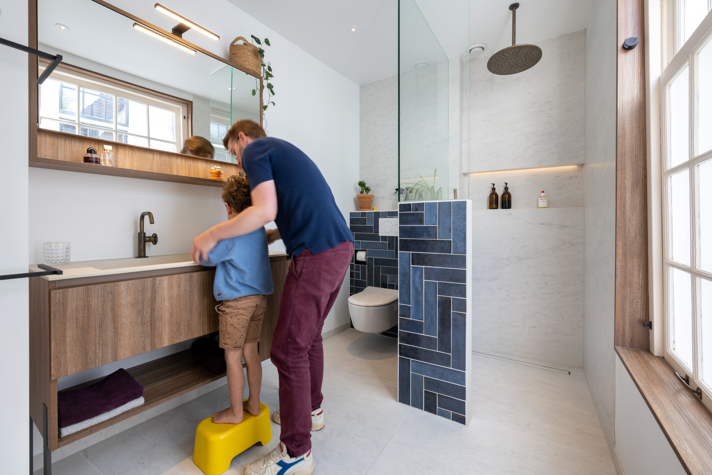 Tijdens een oriënterend gesprek werd er een eerste schets gemaakt en een kleur- en materiaalkeuze uitgezocht, “Een combinatie die ik en mijn partner, Rolf, zonder goede onderbouwing niet snel zouden hebben uitgekozen!”, zegt Dirk, “Ik hou heel erg van echte materialen, echt marmer, echt hout, noem het maar op. Maar door de kennis van onze ontwerper ben ik er echt van overtuigd dat dit een betere keuze is voor deze ruimte. Hij wist echt waar hij het over had. Wat ik vooral belangrijk vond was het behoudt van het authentieke gevoel van het huis en ik ben van mening dat deze combinatie daar de perfecte blend van is geworden.”